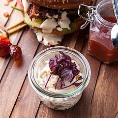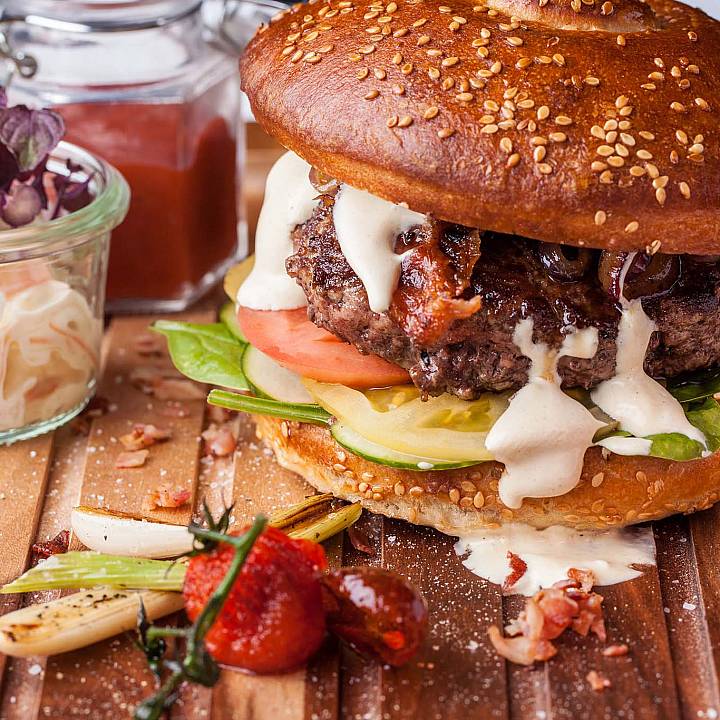 A unique burger in a homemade bun with juicy beef, a Dijon mustard and mayonnaise blend with tangy mountain cheese, crispy bacon and melted red onions.